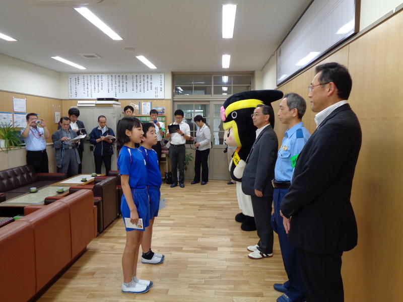 2019年7月8日 15時30分東邦銀行の支店長や野木沢郵便局長、石川町教育長、石川警察署長さんが来校し、石川小学校の校長室で「なりすまし詐欺防止はがき贈呈式」が行われました。はがきは、学校代表で6年生4名に贈呈されました。6年生の男女が代表でお礼の言葉となりすまし詐欺の未然防止にはがきを役立てることを約束しました。