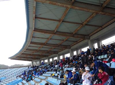 ↓ 選手控え所となった野球場スタンド