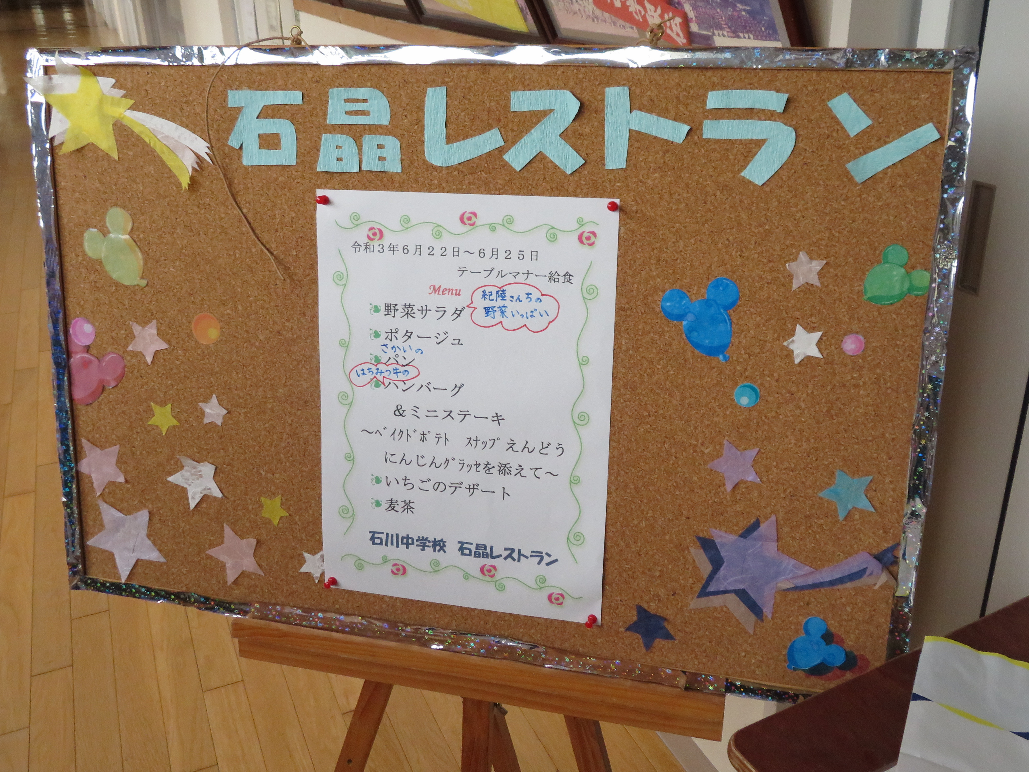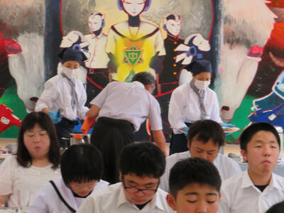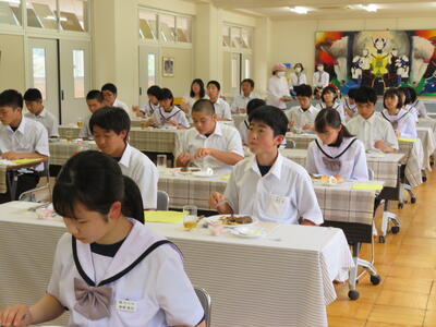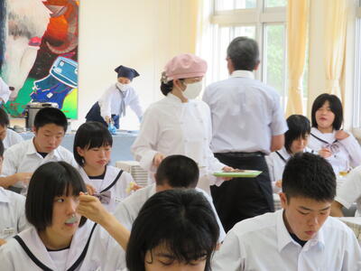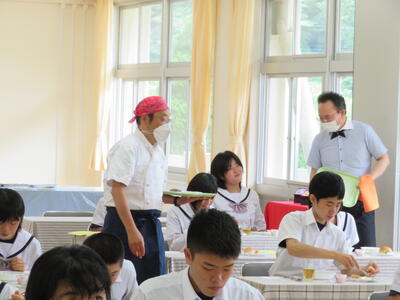 今年度は予防対策を行い実施します。6人グループで楽しく会話しながら行いところですが、全員前を向いて会話は控えます。ウエイター、ウエイトレスは他クラスから募集せず先生たちで行います。1品ずつ出すのではなく、まとめてテーブルの上にあらかじめ置いておきます。事前指導として石川町の食材や社会人としてのマナーなどを学びました。