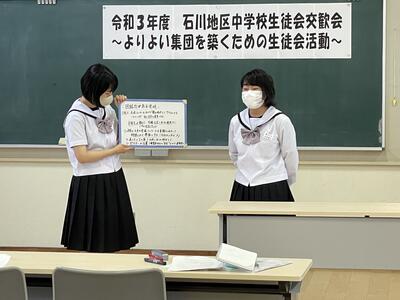 2021年6月30日 10時36分 6月29日(火)、石川地区中学校生徒会交歓会が玉川中学校において開催され、石川中学校から生徒会役員の3年生女子と2年生女子の2名が参加しました。