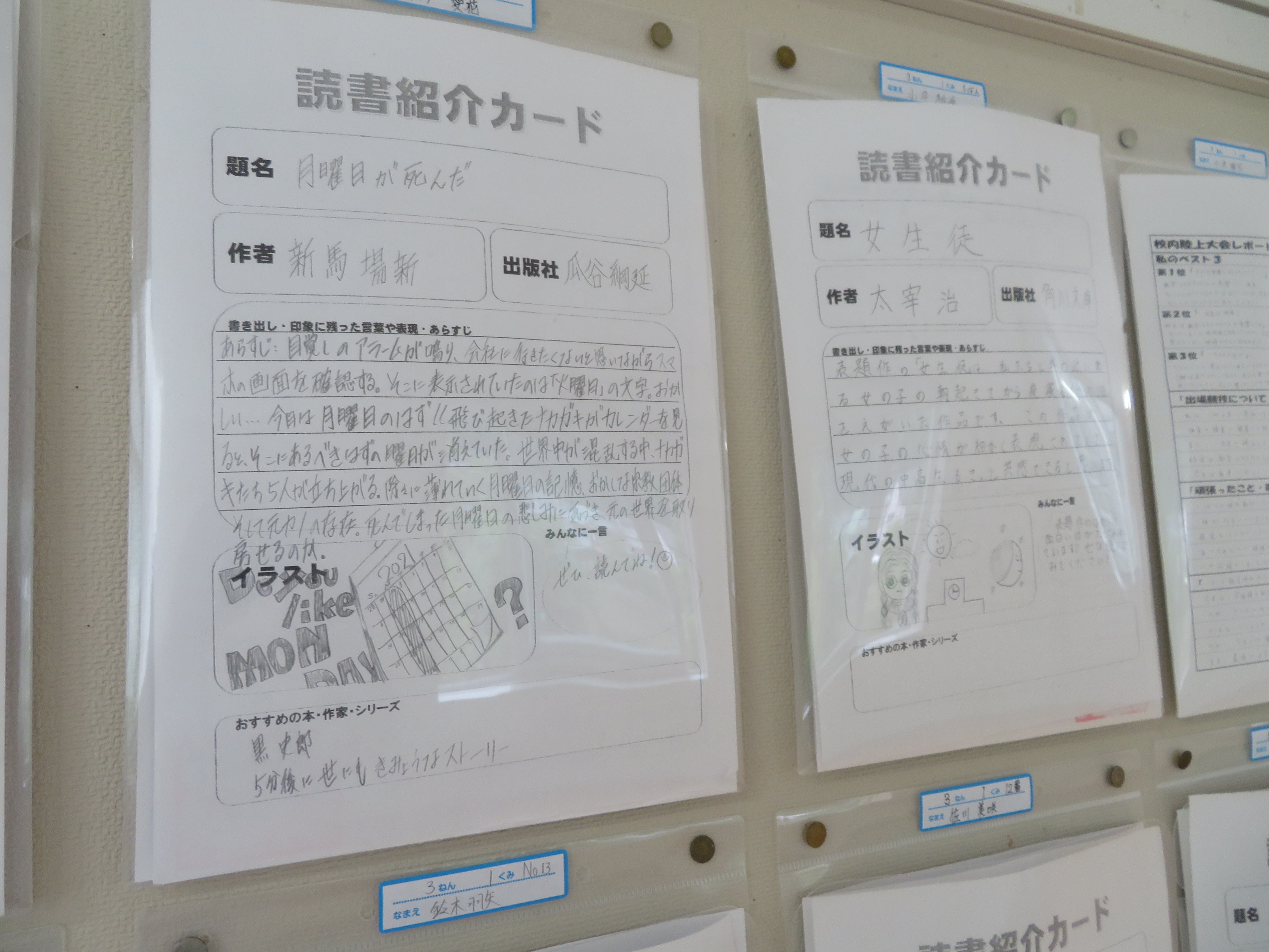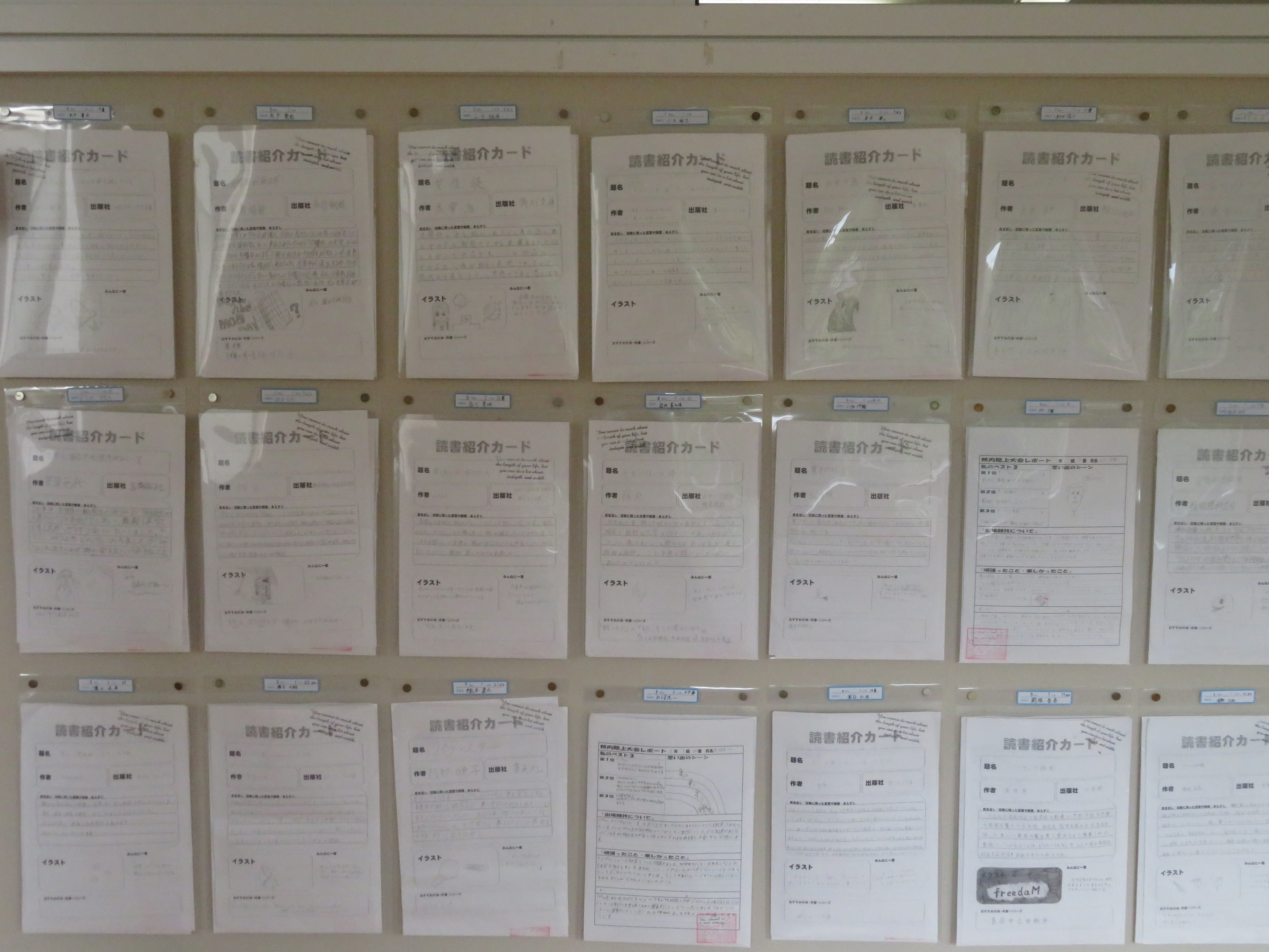 本に親しむことを目的とし、どんどん好きになってほしいと思います。また、読書紹介カードを作成し、おすすめの本の理由や好きなフレーズなどを紹介しています。
