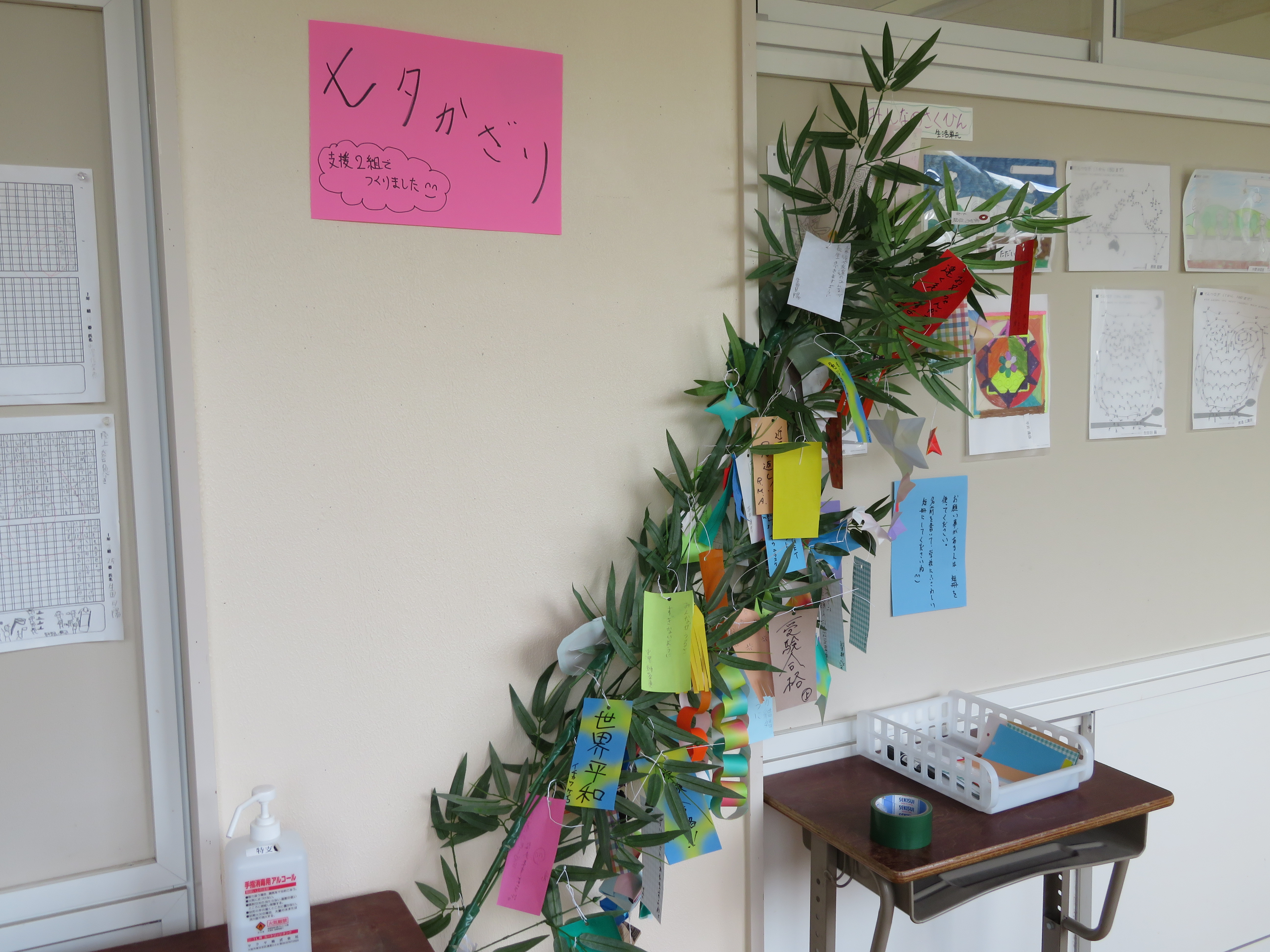 2021年6月21日 17時01分 特別支援学級の教室前廊下に、笹の葉に短冊をつけた大きな飾りができました。