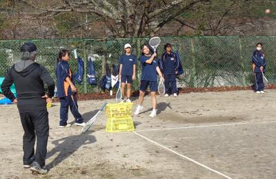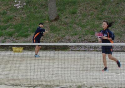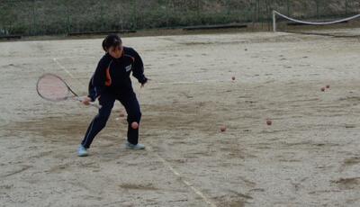 男女とも意欲的に活動しています。雨でコートがぬかるんでいるときは、体育館脇の駐車スペースで練習したり、校舎内で体力トレーニングなどを行っています。今年度は,部活動指導員の方にも指導していただいています。