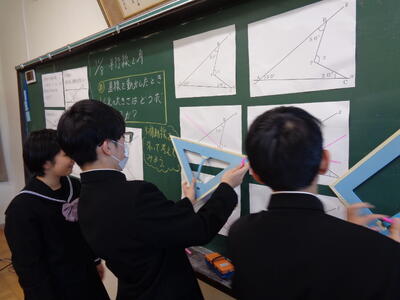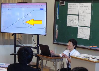↓ 平行や垂線などの補助線をかき加えると,たくさんの考え,解法が出てきました