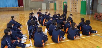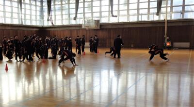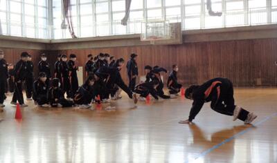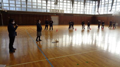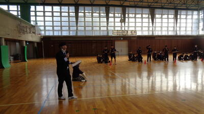 ↓ 体育館で,作業の見通しを担当の先生からきいています