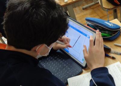 ↓ タブレット端末に連立方程式(二つの式)を考えながら作っています