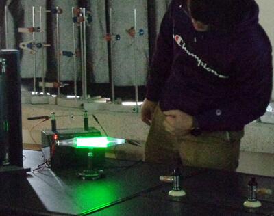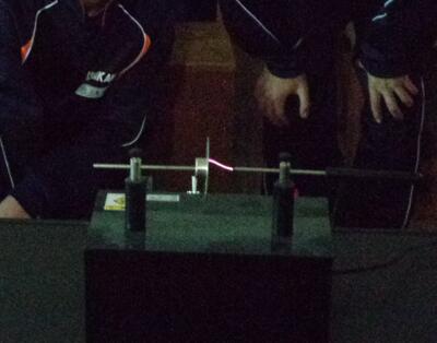 光っているのは,蛍光塗料を塗った板を入れているからですが,邪魔をするものがない時は,まっすぐに放電する様子が分かります。