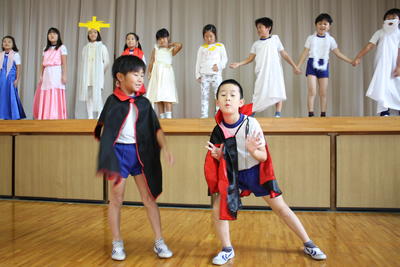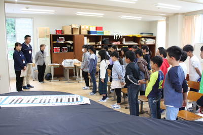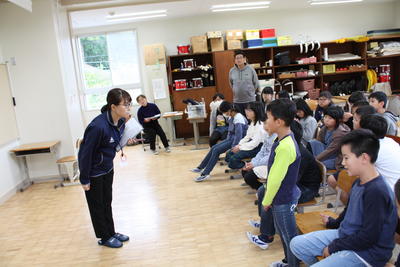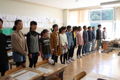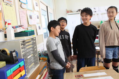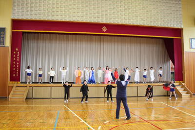 写真は、ある場面で披露する歌の練習の様子です。まだ少し恥ずかしそう?