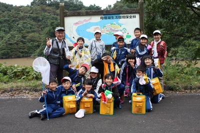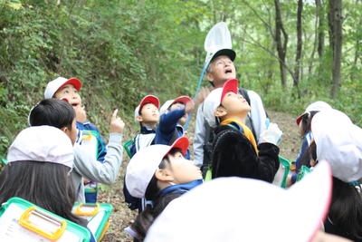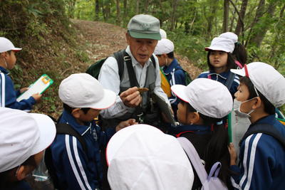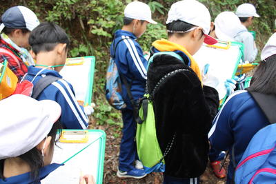 4年生は、森の案内人の先生に案内していただき、母畑レークサイドの遊歩道にて森林環境学習に臨みました。