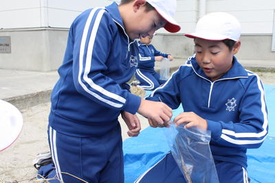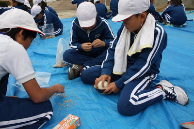 5年生は、総合学習で脱穀、精米に挑戦しました。