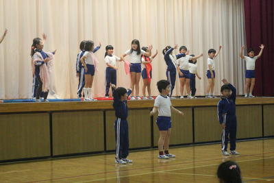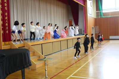 2校時に体育館をのぞきにいきましたら、なにやらカラフルな衣装をまとったお子様がたくさんおりました。