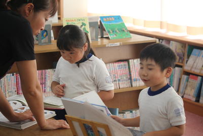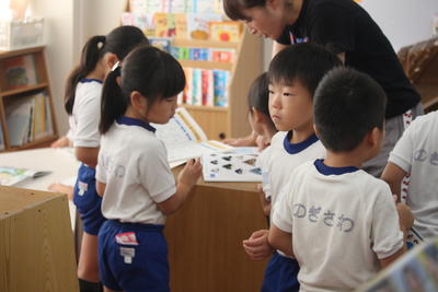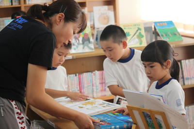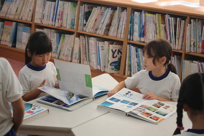 1年生の国語の授業です。後半は図書室にいって,調べ学習のための本を探していたようです。