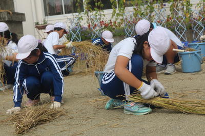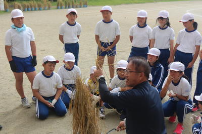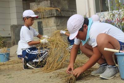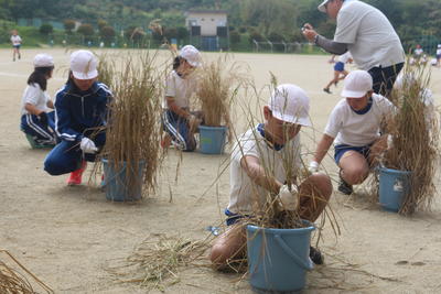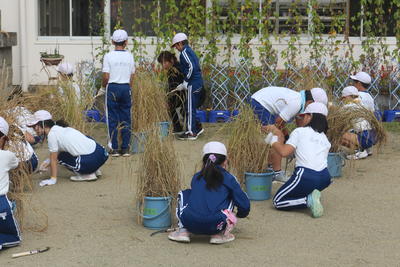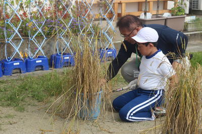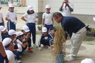 JAさんにご指導いただいて,夏休み前から育ててきたバケツ稲の稲刈りを行いました。鎌の使い方なども教えていただきながら取り組みました。