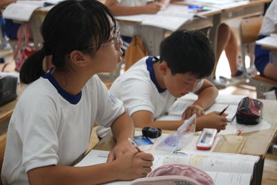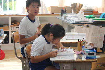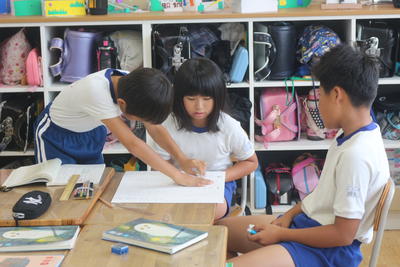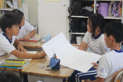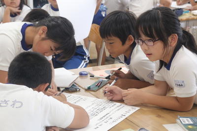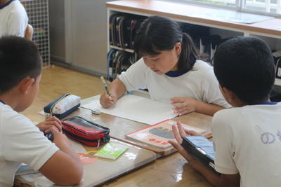 5年生の国語の授業では「いじめをなくそう」などの提案書を班で話し合いながら作成していました。