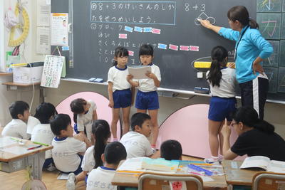 1年生は、算数の授業中でした。答えが10を超えるる足し算の勉強で,自分の考えをみんなの前で発表しています。