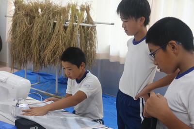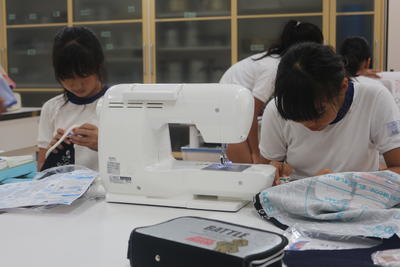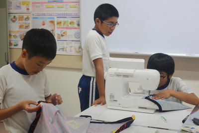 家庭科の授業でエプロンを製作中の6年生です。だんだん完成に近づいてますが,ミシンのつい方にはもう慣れましたか。