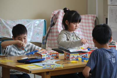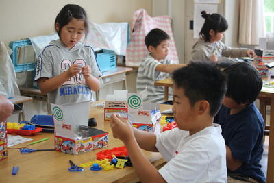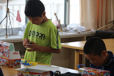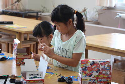 4年生の理科の授業の様子です。乾電池(電気)のはたらきを調べるために模型の自動車を楽しく作っています。