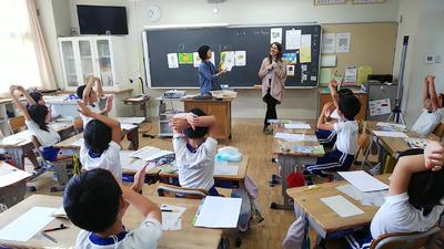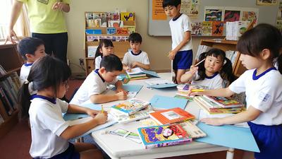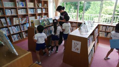 1年生は、図書室の本を借りています。2年生は、体育の授業中です。そして3年生は、外国語活動でした。