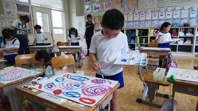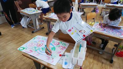 1年生の図工の授業です。なにやら画用紙にぐるぐる描いています。何が描きあがるか楽しみです。