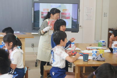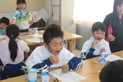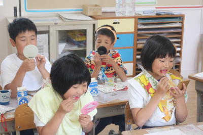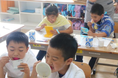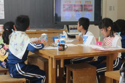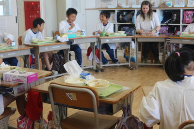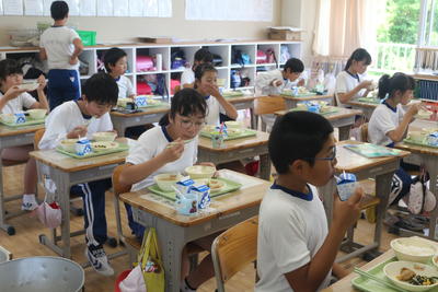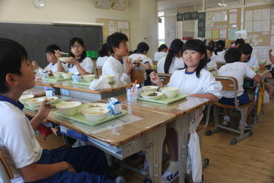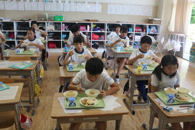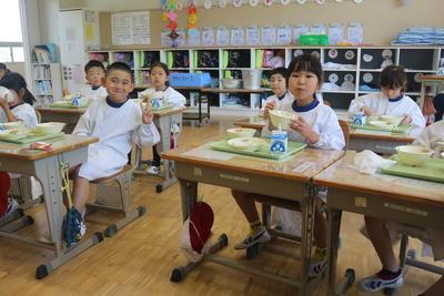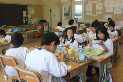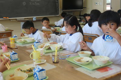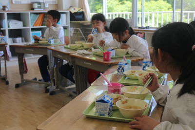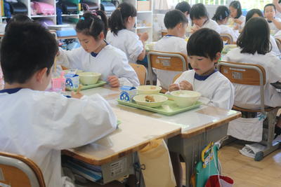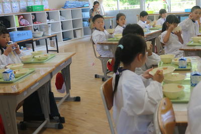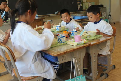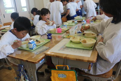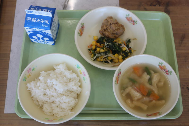 今日の給食の献立は,「ごはん」「牛乳」「ジャガイモとインゲンのみそ汁」「鶏肉のオレンジ煮」「もやしとコーンの中華和え」でした。各学年とも楽しそうに食事をしていました。