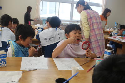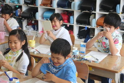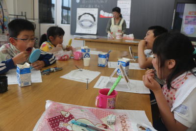 今日の歯科教室は,3・4年生です。1・2年生の時に学んだことをもとに、一歩進めて歯がよく磨けているか,もう一度調べてみました。