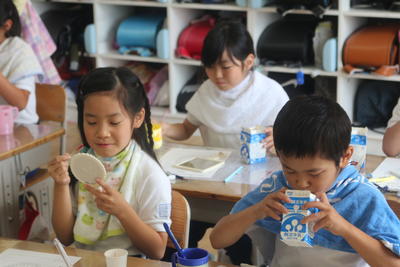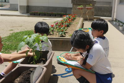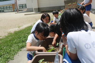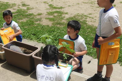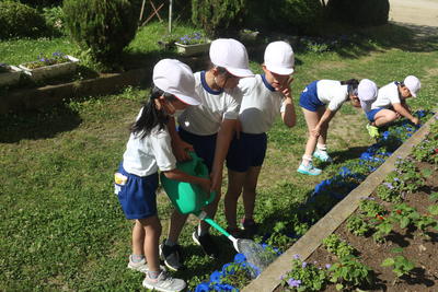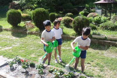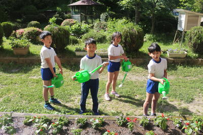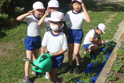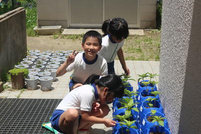 今朝は,梅雨の合間のすばらしい天気になっています。子ども達は,朝の会が始まる前に自分たちが植えた植物に水やりをしていました。