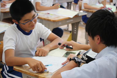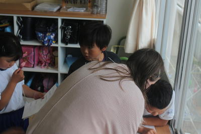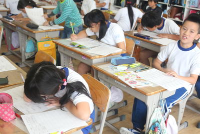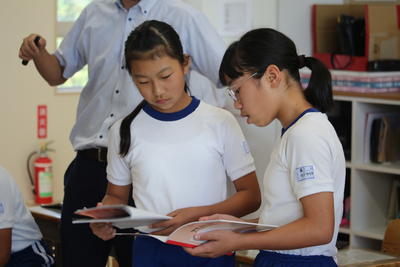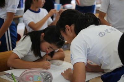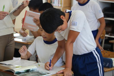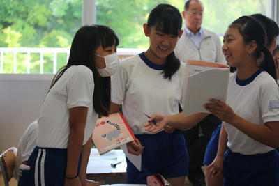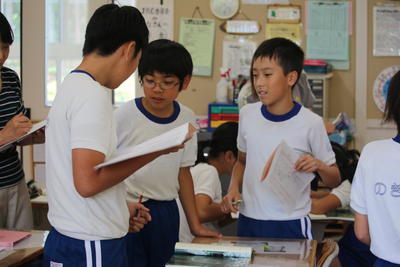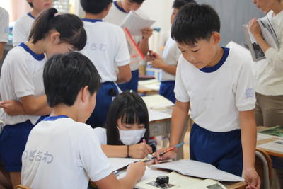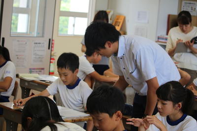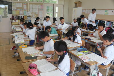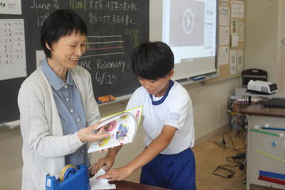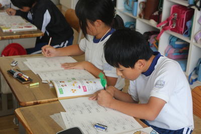 5年生の外国語活動の様子です。今日は,みんな苦手な書く学習をして正解かどうか見てもらっているようです。