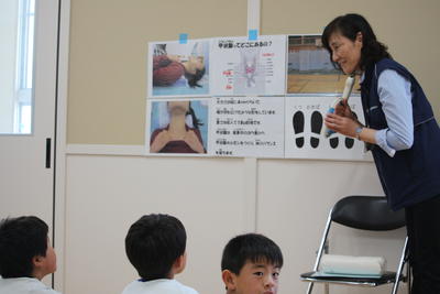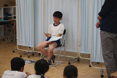 甲状腺検査が行われています。担当の方から検査の概要を説明していただいた後,全校児童一人ずつ検査をしてもらっています。