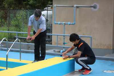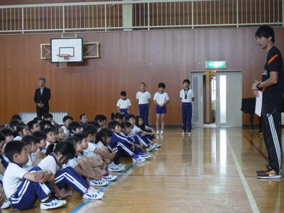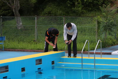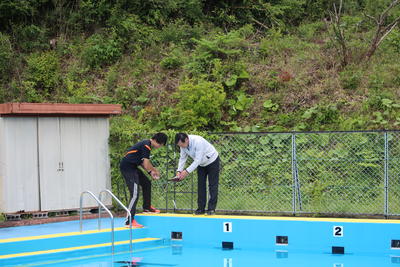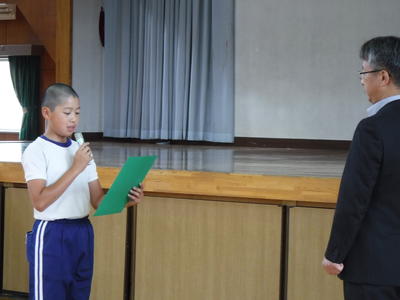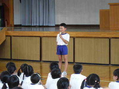いよいよ水泳学習が始まりますが、今日はプール開きが行われ学習中の諸注意,誓いの言葉などが発表されました。この後,プールで安全祈願などが行われます。