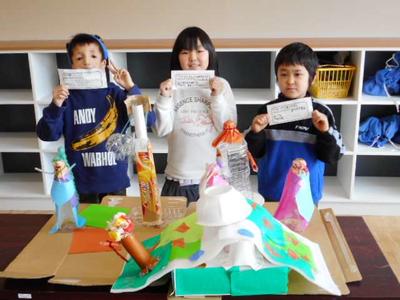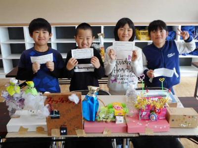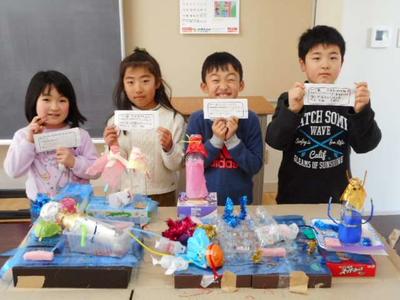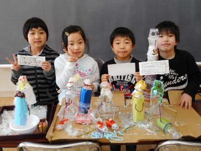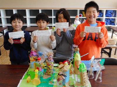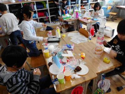 2年生は,図工の授業で「ピコリン星 ゆめのステージ」と題して5班に分かれて,それぞれ「町」「雪」「海」「ジャングル」「山」とテーマを決めて作品作りをしました。そのあと作品を前に班ごとに記念撮影を行いました。