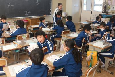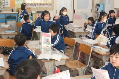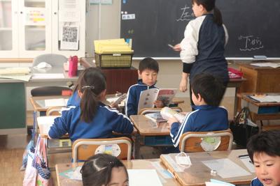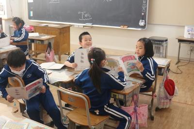 1年生の算数の授業の様子です。「ばしょをあらわそう」という学習で「右から・・・」「上から・・・」と教科書を使ってグループを変えながら勉強しています。