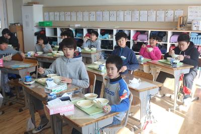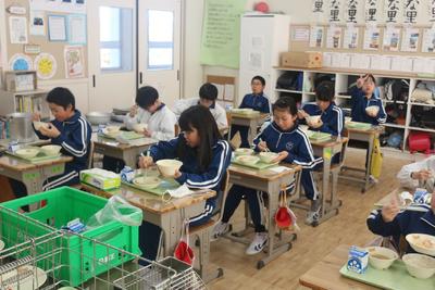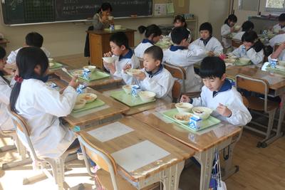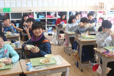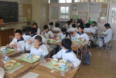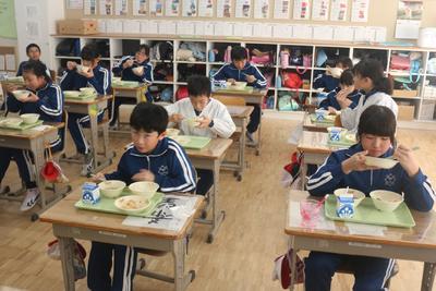 今日の給食の献立は「ごはん,なめこ汁、サケの照り焼き,大根のみそ煮,牛乳」でした。みんな楽しく給食を食べています。