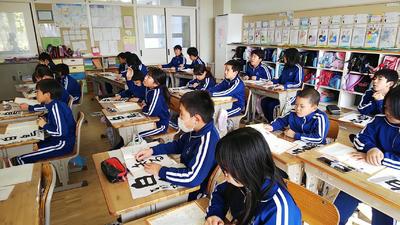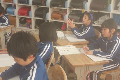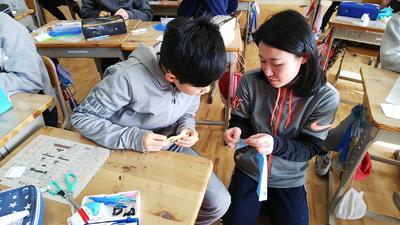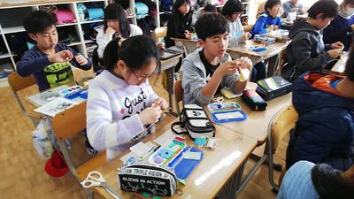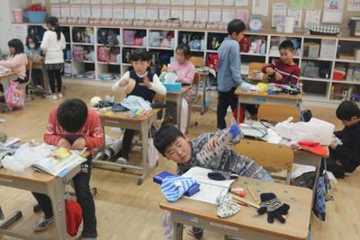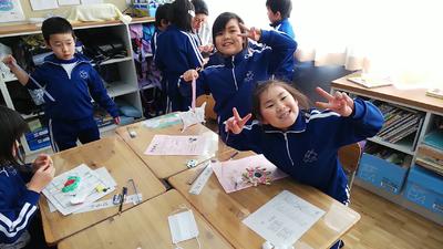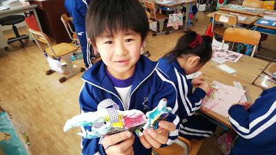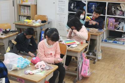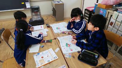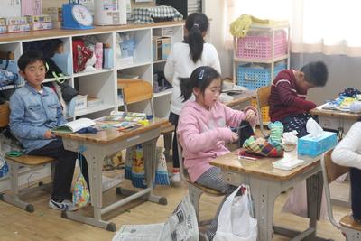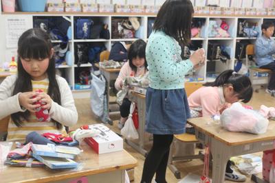 3年生の図工の授業は,「みんなで協力して」干支の十二支を作ろうということで、布きれや毛糸を使ってヒツジやウサギなどを作っていました。