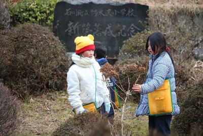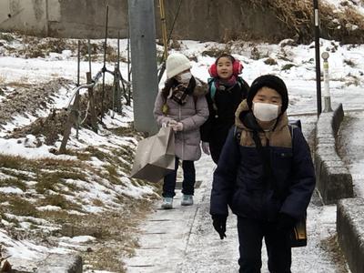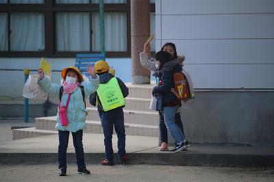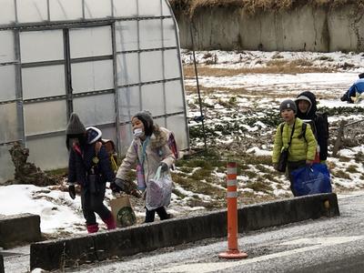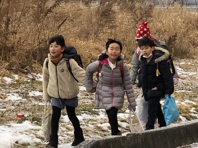 今朝は、地面がうっすらと雪に覆われていました。そんな中、今日も子どもたちは元気に登校してきました。