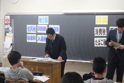 6年生を対象に、租税教室が行われました。税金制度がなくなるとどんなことが起こるのかアニメで学習した後、講師の先生から税に関するいろいろなことを学ばせていただきました。後半は一億円の札束の模型をみんなで手に取りその大きさに驚いていました。
