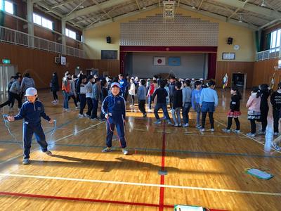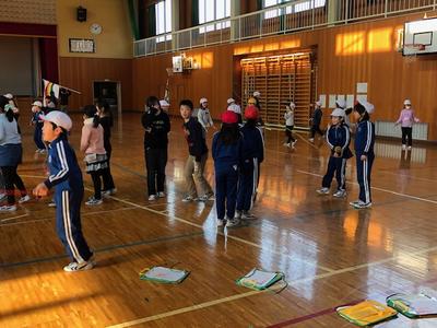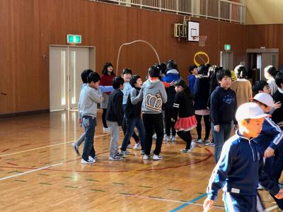 2時間目が終わって、たくさんの子どもたちが体育館に向かいます。多くの児童の目的は、なわとび大会へ向けての練習です。個人種目の練習をする児童、長縄跳びの練習をするグループとそれぞれに目標に向けて練習に取り組んでいます。