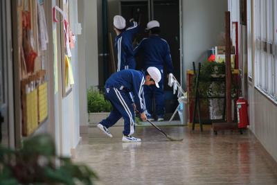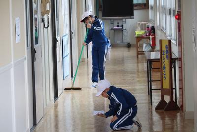 給食(今日は和風タンメンでした。)を食べて、昼休みはみんなと遊んだり鼓笛の練習で過ごし、いよいよ掃除の時間です。縦割り班で、自分の役割をしっかりやろうとがんばって清掃しています。