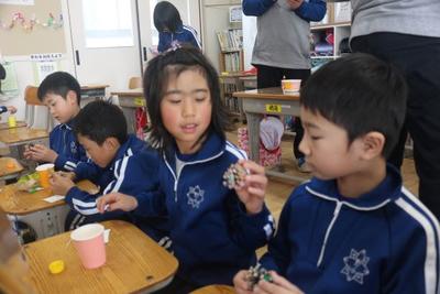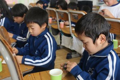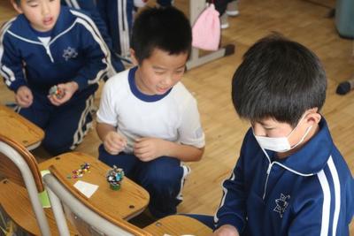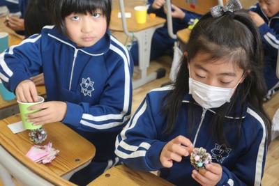 いよいよ2学期も明日で終わりです。2年生は,クリスマス会も兼ねてお楽しみ会をひらきました。会の最後にみんなで松ぼっくりを使ったクリスマスツリーを作りました。