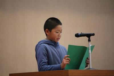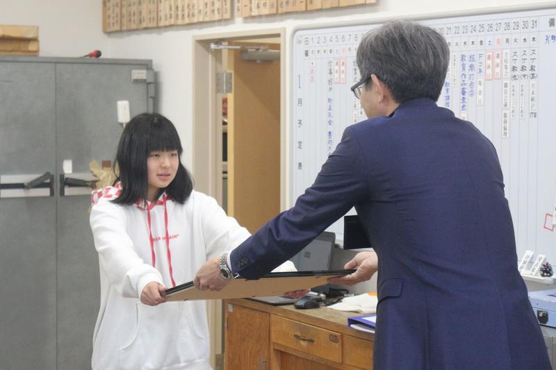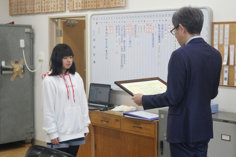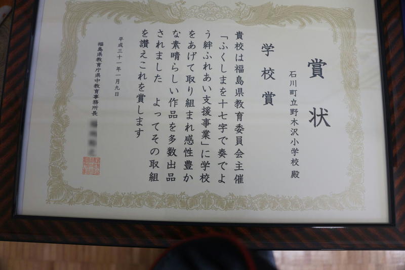 2019年1月11日 14時51分昨日、県中教育事務所長、担当主事に来校していただき、福島県教育委員会主催「ふくしまを十七字で奏でよう絆ふれあい支援事業」の学校賞の表彰をしていただきました。学校を代表して6年生児童が受賞しました。この学校賞は、この事業に学校をあげて継続して取り組むとともに、その作品一つ一つの完成度合いが優れている学校に送られるものです。
