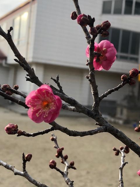 学校の校庭では季節を間違えたのか,紅い梅の花が開いています。