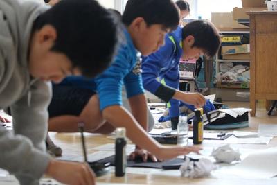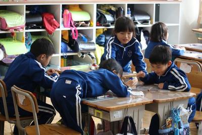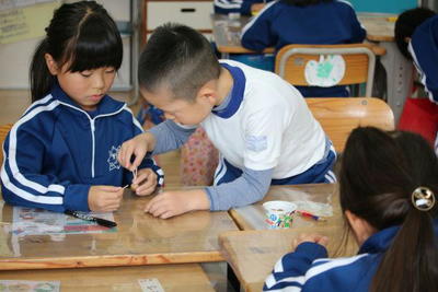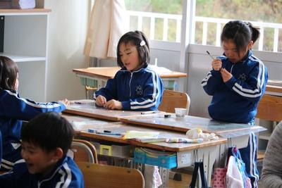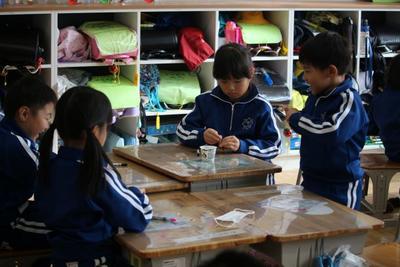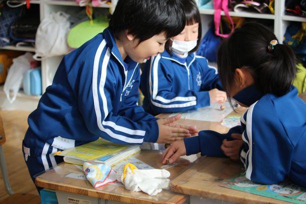 1年生が図工の授業の時間にどんぐりでこまを作っていました。こまに顔を描いたりしてうまく回っているこまもたくさんありました。みんな楽しそうです。