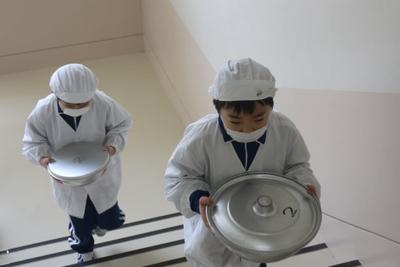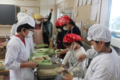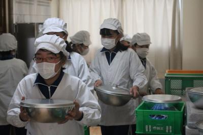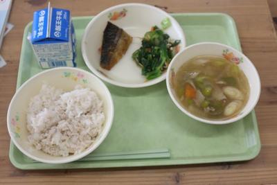 今日の給食の献立は「麦ごはん、さつま汁、さばのみそ煮、牛乳、青菜とえのきのあえ物」でした。今日も当番は,みんなで協力して準備しています。
