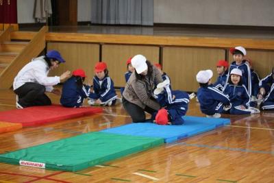 1年生の体育の授業は,マット運動(後転)です。はじめに準備運動も含めて運動身体作りプログラムを行ったあといよいよマット運動で後転の練習でしたが、まだまだ練習が必要なようです。