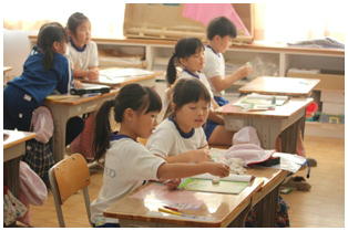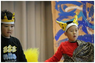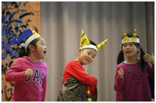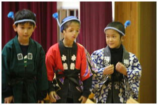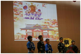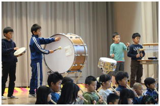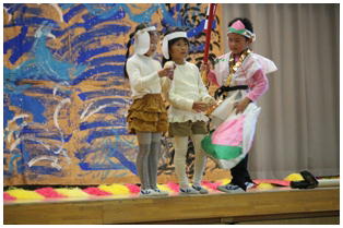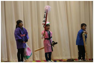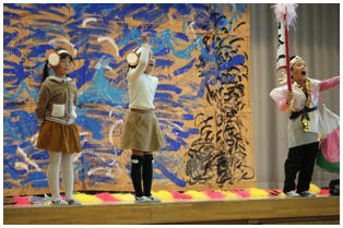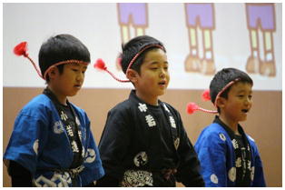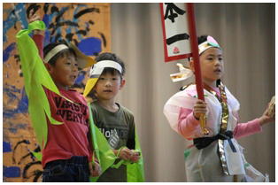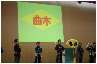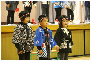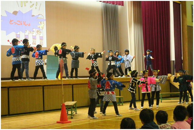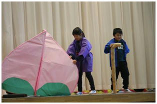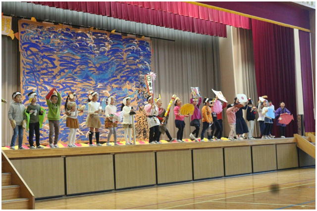 学年後との発表の一番手は,1年生による劇「ももたろう」でした。22名全員で元気いっぱいに演じきることができました。