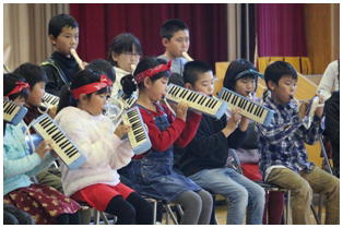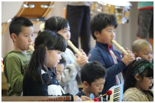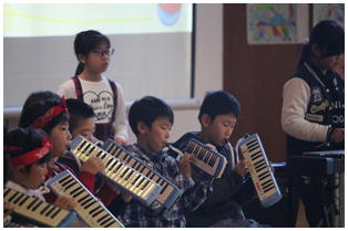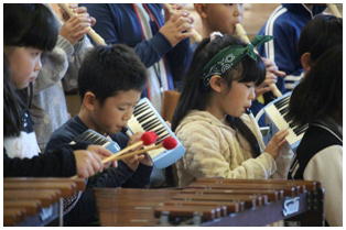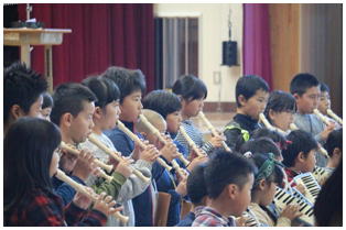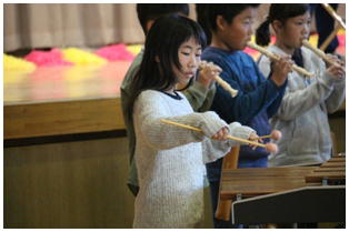 平成30年度野小フェスティバル,最初は3・4年生による合奏の発表でした。「スーパーカリフラジリスティックエクスペリアリドーシャス」と「サザンカ」の2曲を聴いていただきました。