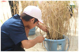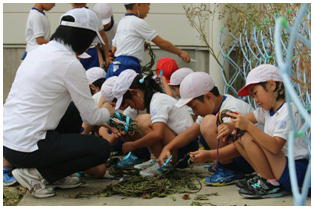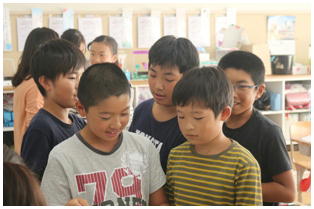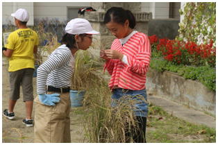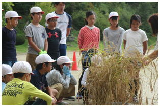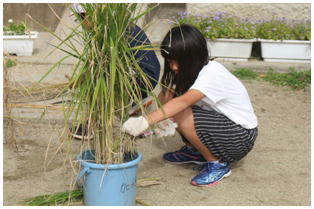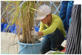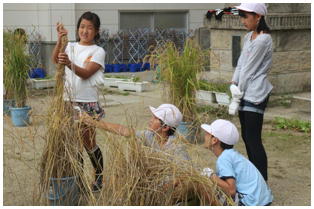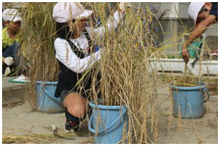 1学期からJAさんの指導の下,バケツで稲を育てていた5年生の稲刈りが行われました。鎌の安全な使い方から丁寧に教えていただき,これまで育ててきた稲の収穫を自分の手で行いました。自分たちが毎日食べている米ができるまでに、こんなにも長い時間が必要であることに気づいてくれればと思います。