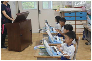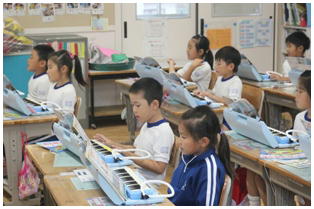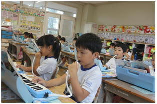 1年生の音楽の授業の様子です。久々の鍵盤ハーモニカを使っての授業の様子です。久しぶりの鍵盤ハーモニカでしたが、みんなよくできていました。廊下には、一生懸命育てた朝顔の蔓で作ったリースが飾ってありました。