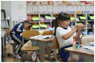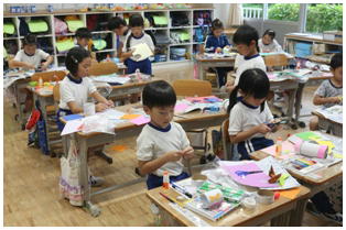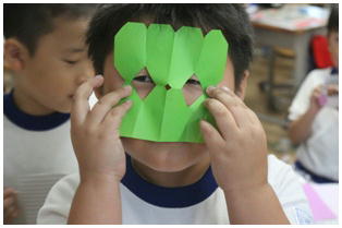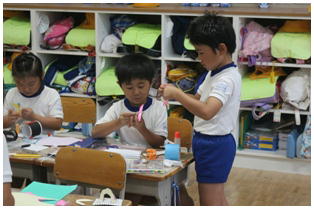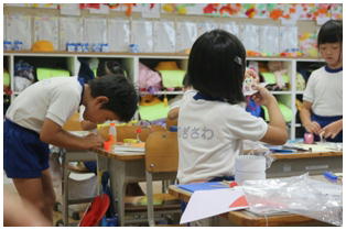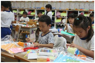 1年生の教室をのぞいたところ、図工の授業でいろいろな紙の材料を使って、ものづくりをしていました。