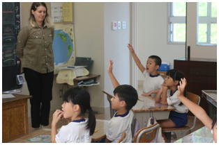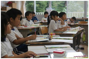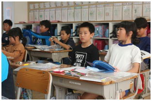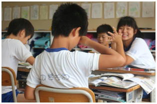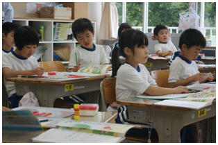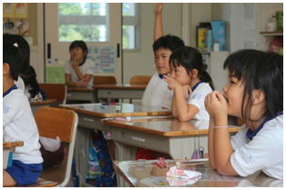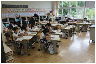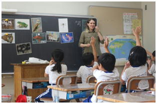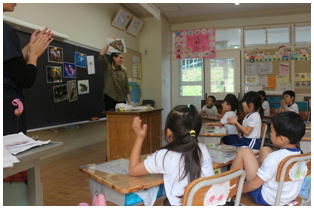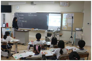 1年生は、ALTの先生と「動物を英語で言うと?」を、カラー写真を黒板に貼って楽しい授業を進めていました。