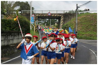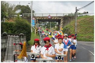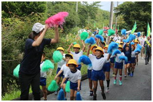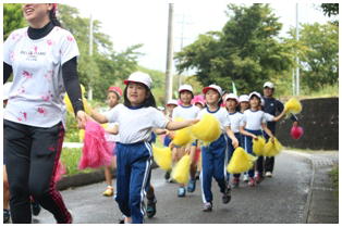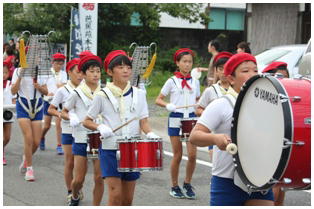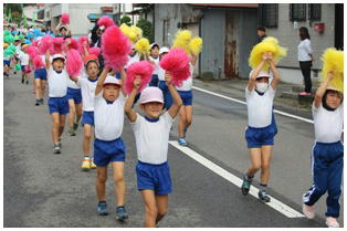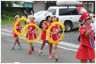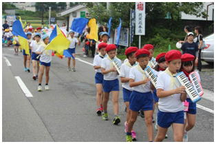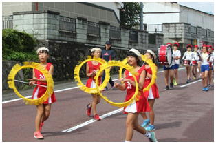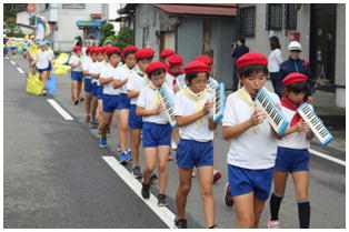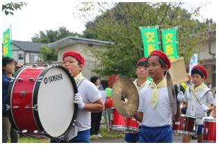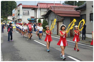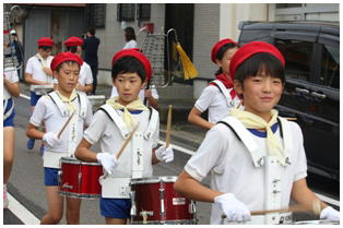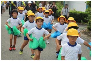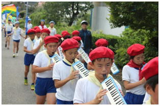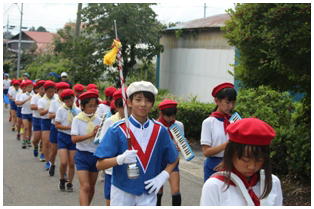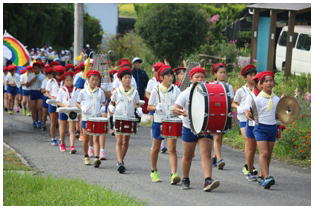 午前中の雨もようやくあがって、出発式は当初予定の校庭から保育駐車場へ変更しての鼓笛パレードの始まりです。子ども達もせっかく練習してきたのにパレードができなくなるのではと心配そうでしたが晴れの舞台がととのってやる気満々です。